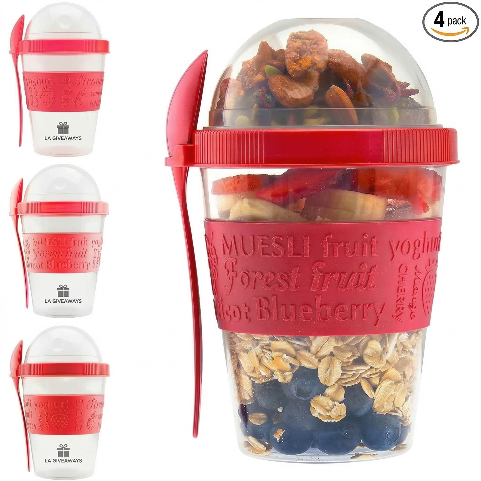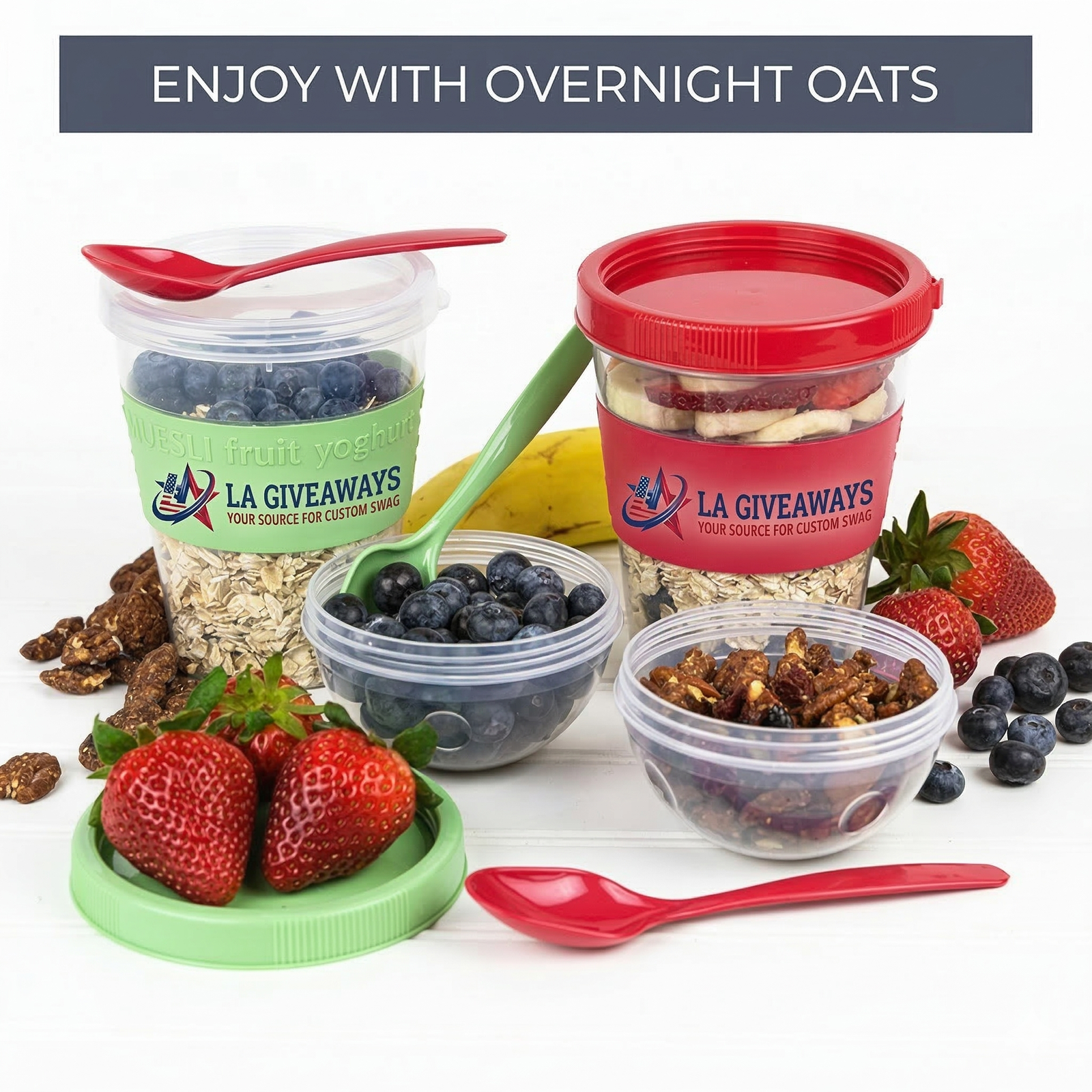 20oz portable parfait and overnight oats cups with separate topping compartments and spoons. BPA-free, leak-proof containers for meal prep or travel.