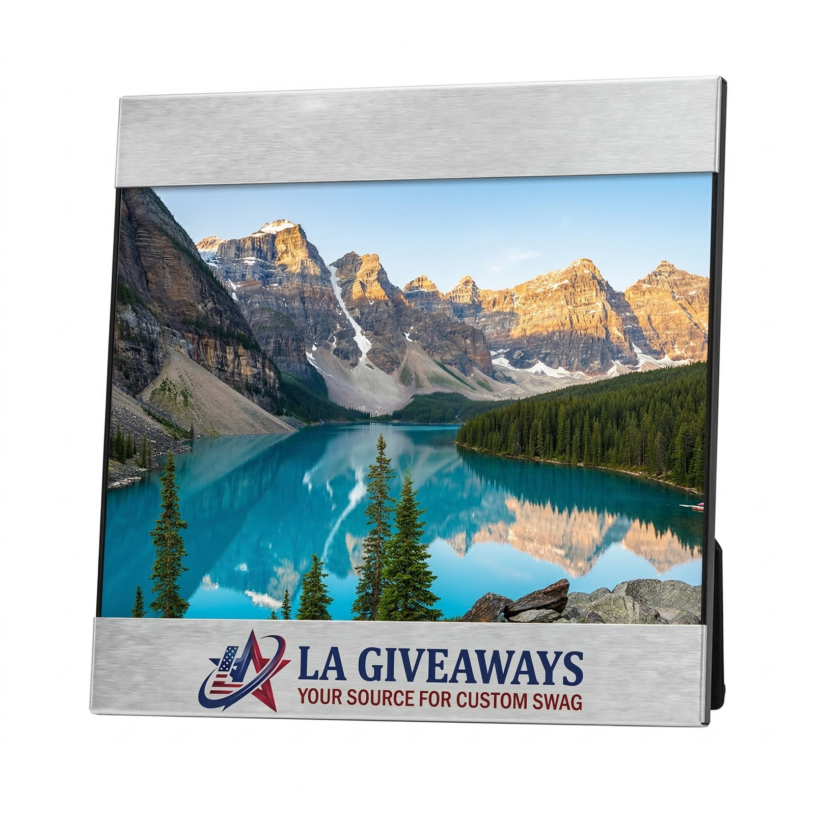 Premium 4″x6″ brushed aluminum photo frame with easel back and hanging hole. Gift boxed and ready for one-color screenprint or silkscreen imprint.