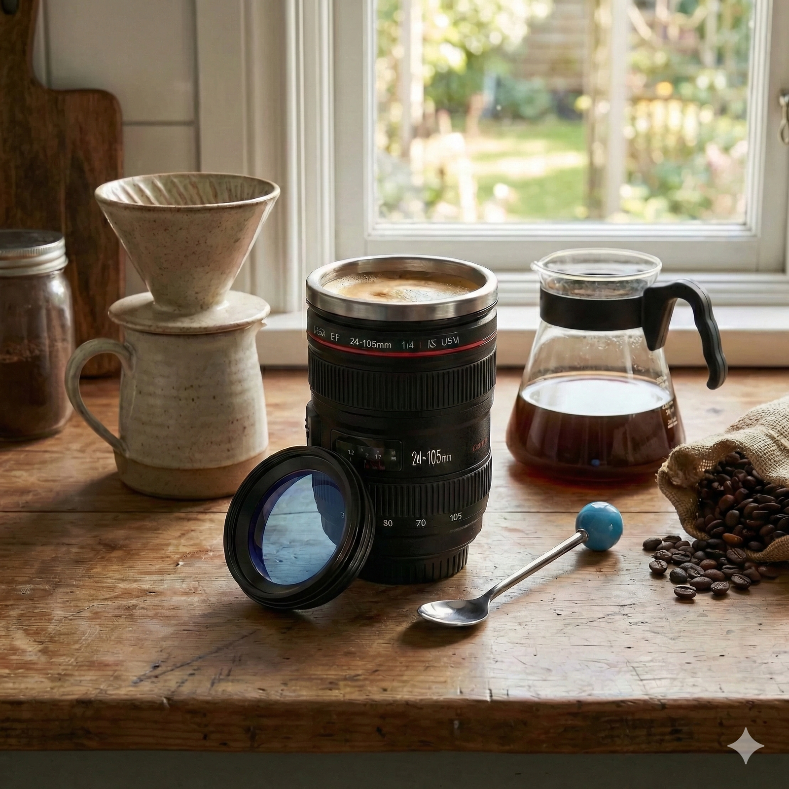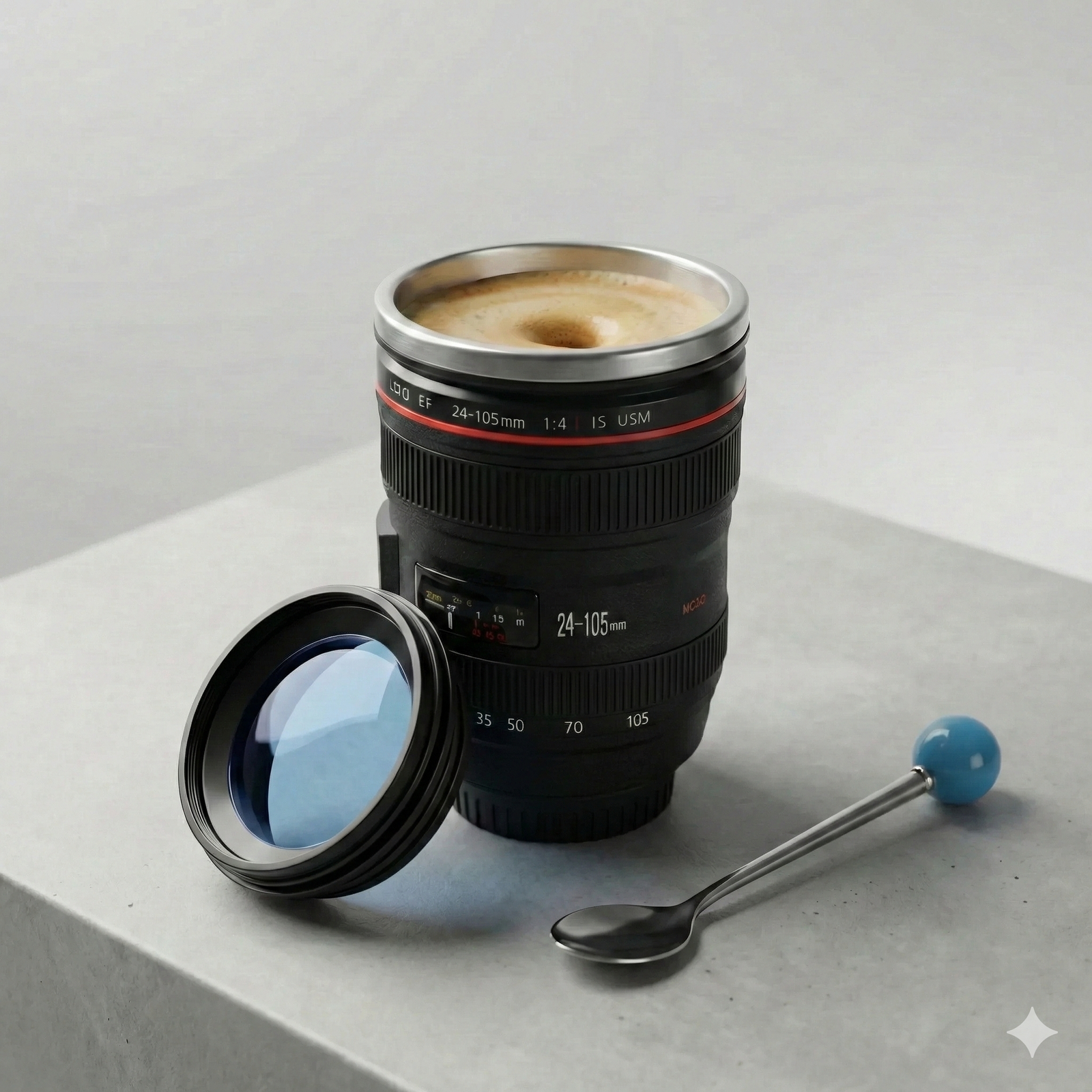 Camera lens style coffee mug with stainless steel lining keeps drinks warm, spill resistant, perfect gift for photographers users.