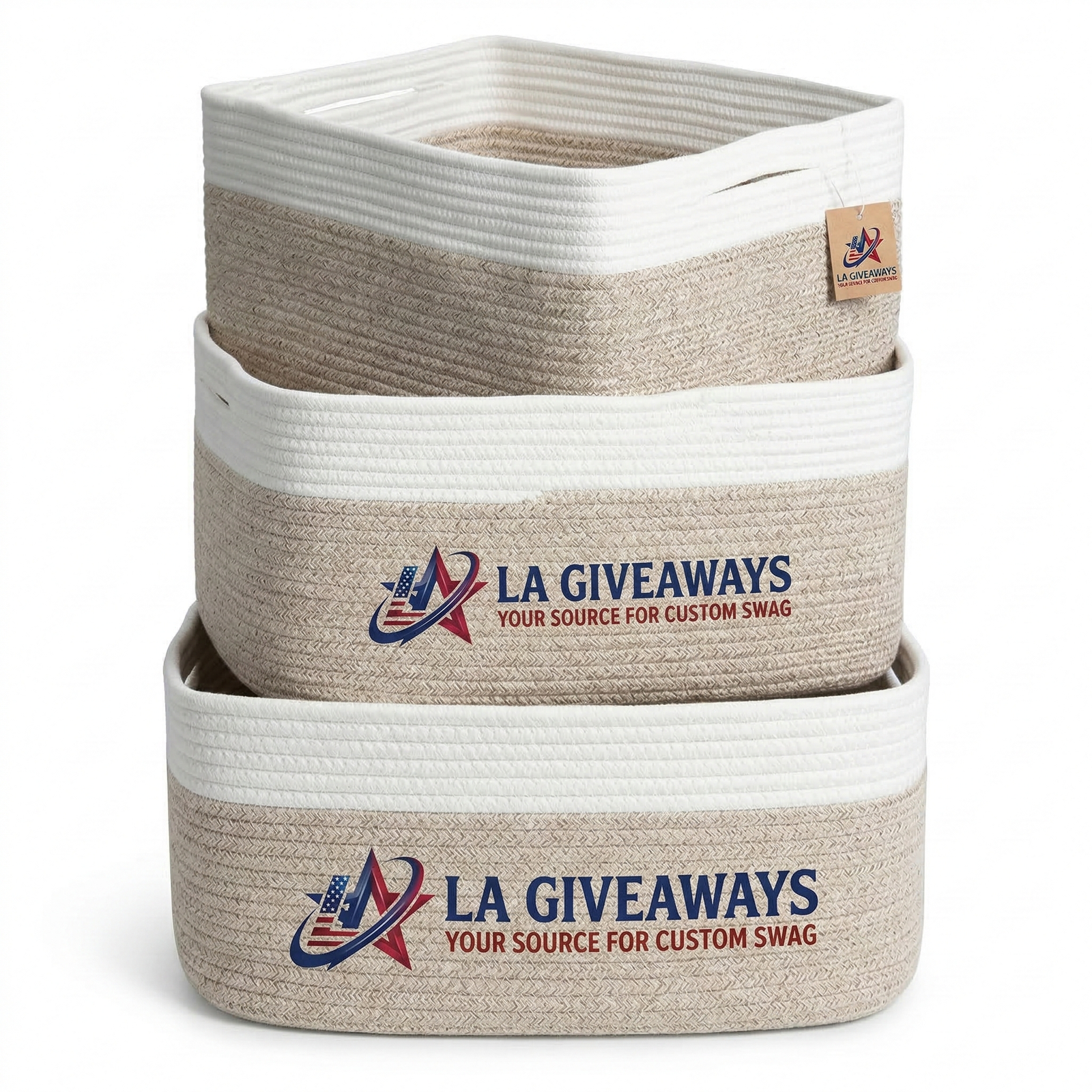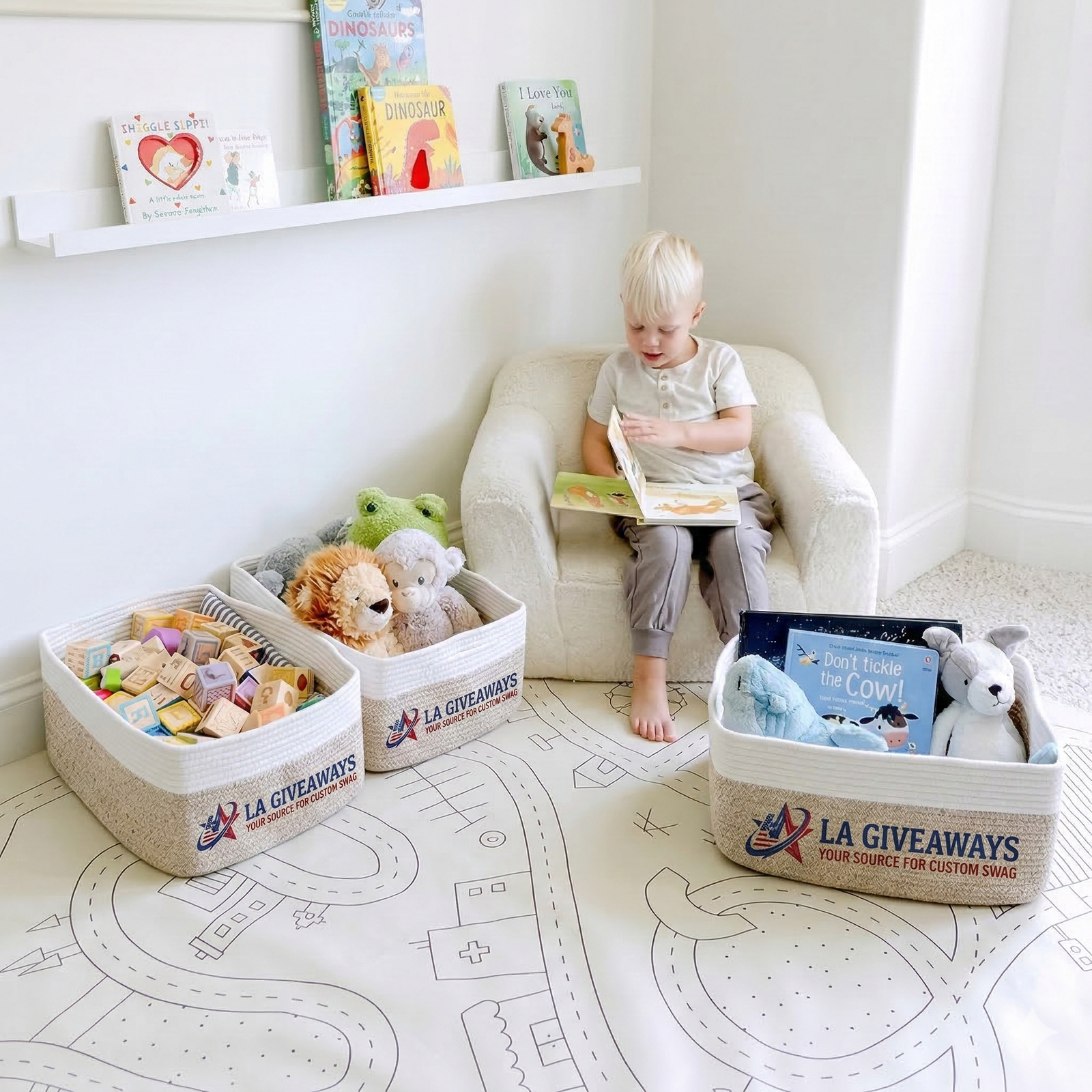 Set of three cotton rope storage baskets with reinforced hidden handles. Stylish rectangular bins ideal for organizing toys, clothes, blankets, and home items.
