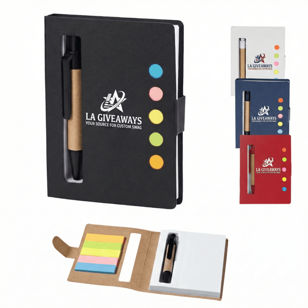 Eco-friendly sticky notes booklet with pen and colored flags keeps you organized while supporting sustainable practices.