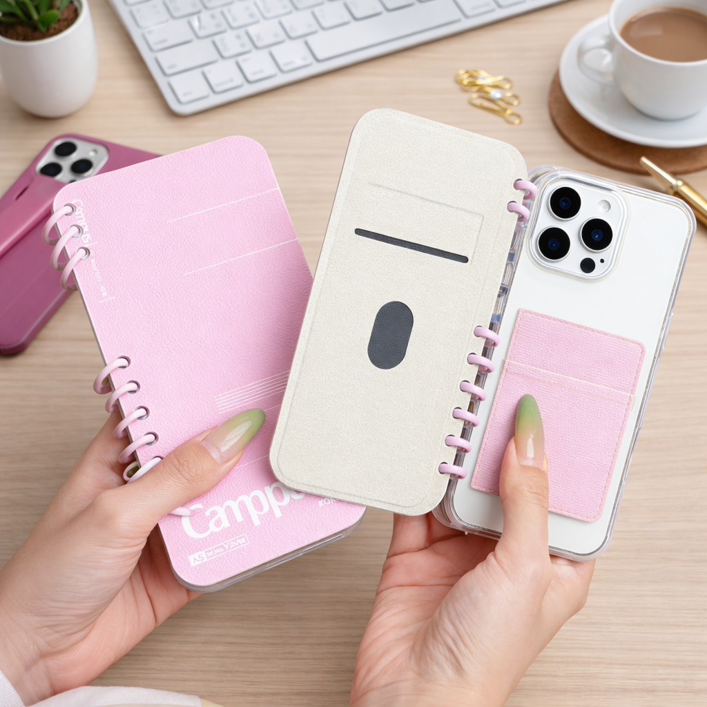 Premium flip notebook iPhone case with card slots, full protection, and custom logo printing option.