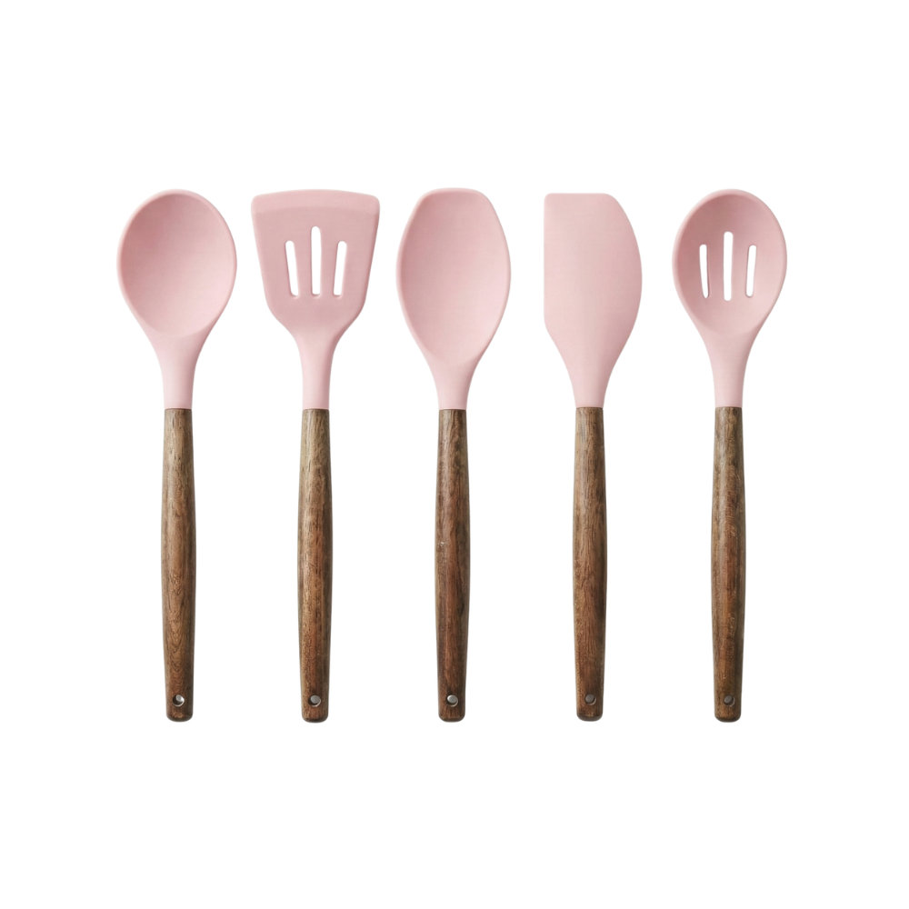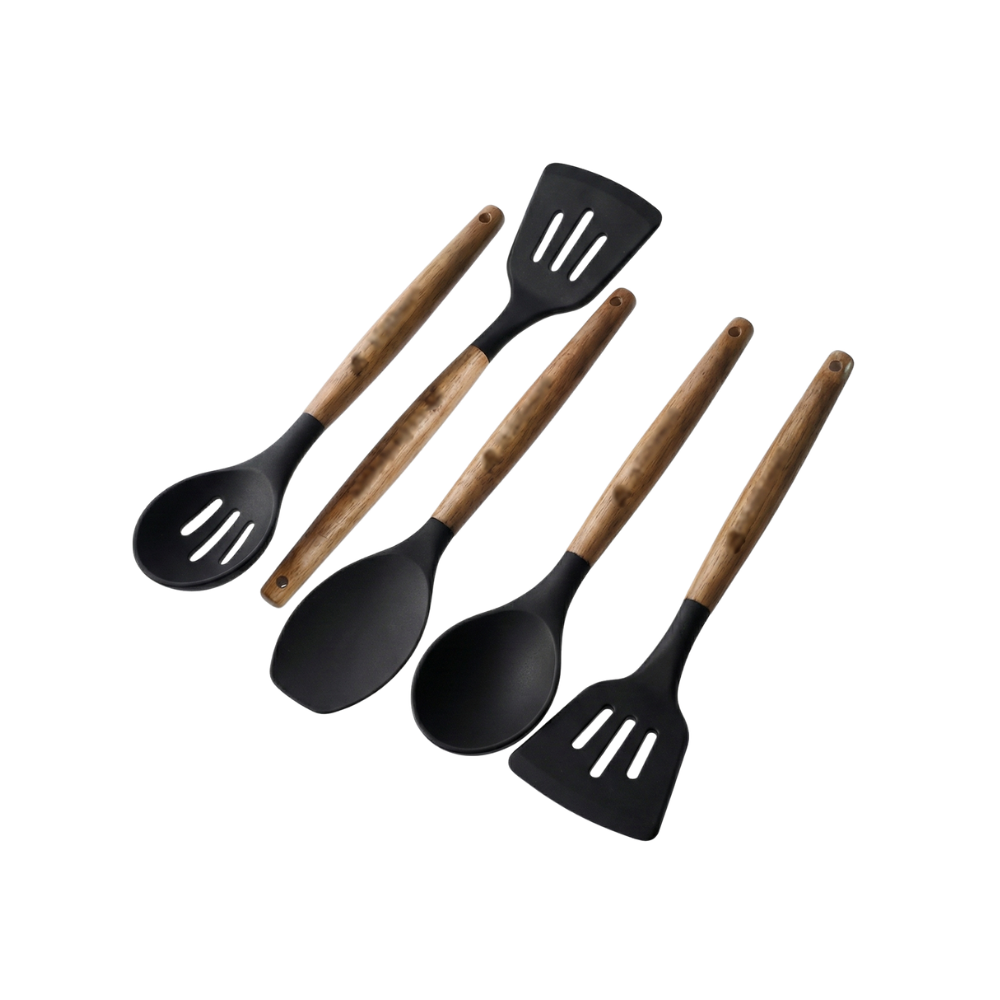 Five piece wooden cooking utensil set with acacia handles and silicone heads offering comfort durability and everyday cooking pe