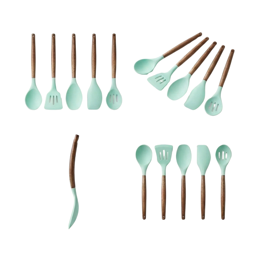 The Wooden Cooking Utensils Set is a sophisticated addition to any kitchen, blending premium materials with ergonomic design to enhance your cooking routine.Each utensil in this five-piece collection-including a spoon, spoonula, spatula, turner, and slotted spoon-is meticulously crafted from natural Acacia hardwood handles, known for its durability and elegant grain patterns. The handles provide a comfortable, non-slip grip, ensuring precise control during food preparation, while the high-quality silicone heads are engineered for versatility and safety. This combination not only offers a balanced feel but also resists wear and tear, making it suitable for daily use in both home and professional settings.The set’s thoughtful construction prioritizes functionality without compromising