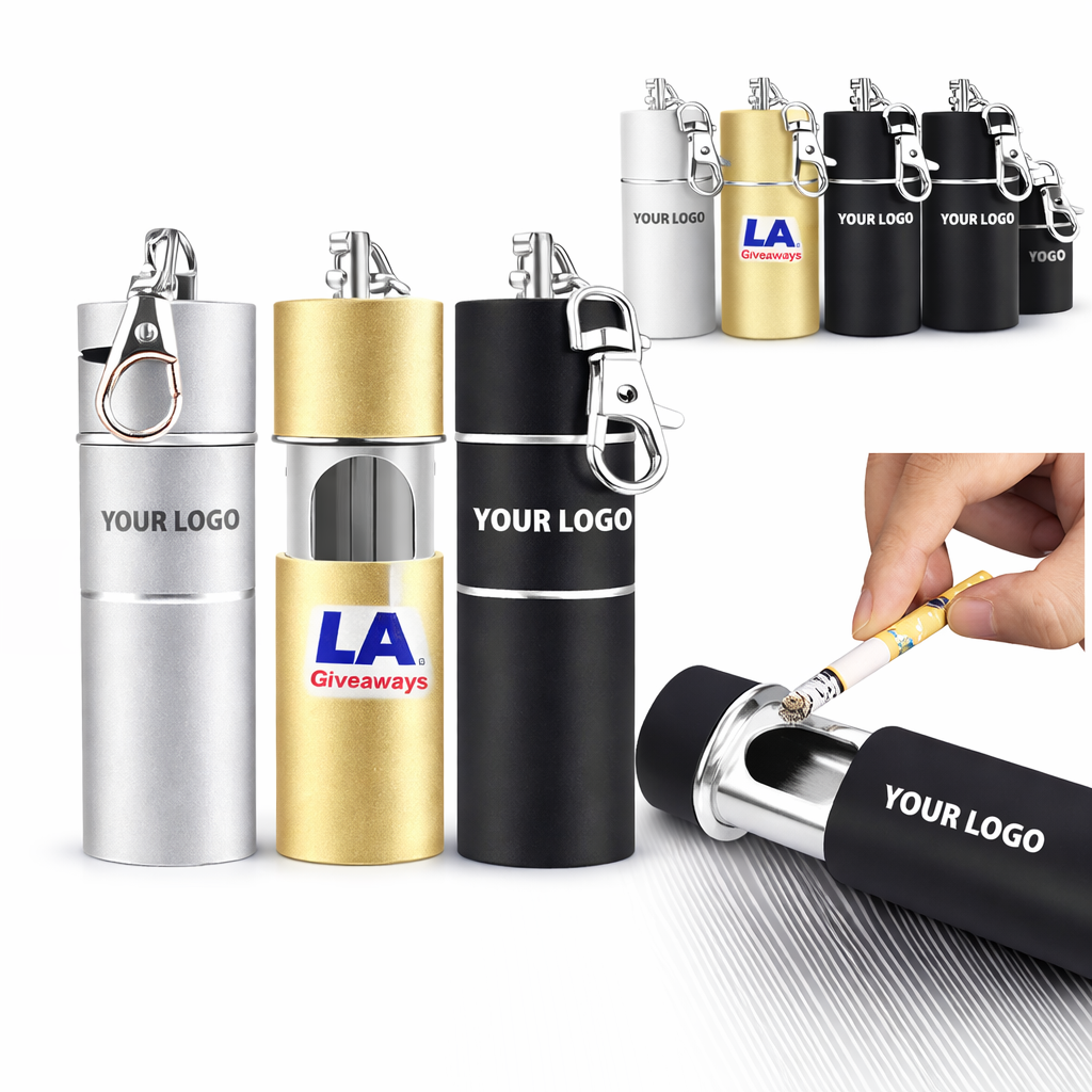 Compact metal pocket ashtray keychain with custom logo option. Stylish, durable, and perfect for promotional branding & daily use.