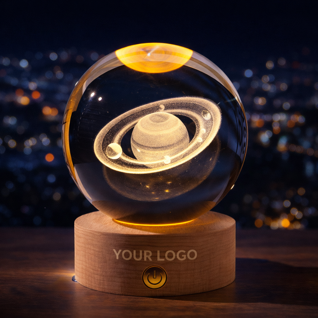 The 3D Interior LED Crystal Glass Ball Night Light is a beautiful decorative ornament designed to create a magical and relaxing atmosphere. Made from premium K9 crystal glass, the sphere features detailed 3D laser engravings such as galaxy, universe, or solar system designs that appear suspended inside the crystal. When placed on the LED wooden base, the warm light illuminates the internal design, creating a stunning luminous display. The natural wooden base adds a modern and elegant touch while providing stable support for the crystal ball. Powered by a convenient USB connection, the lamp is suitable for bedrooms, living rooms, offices, and desk decoration. Ideal as a gift, souvenir, or promotional item, the crystal ball can also be customized with logos or special engravings.