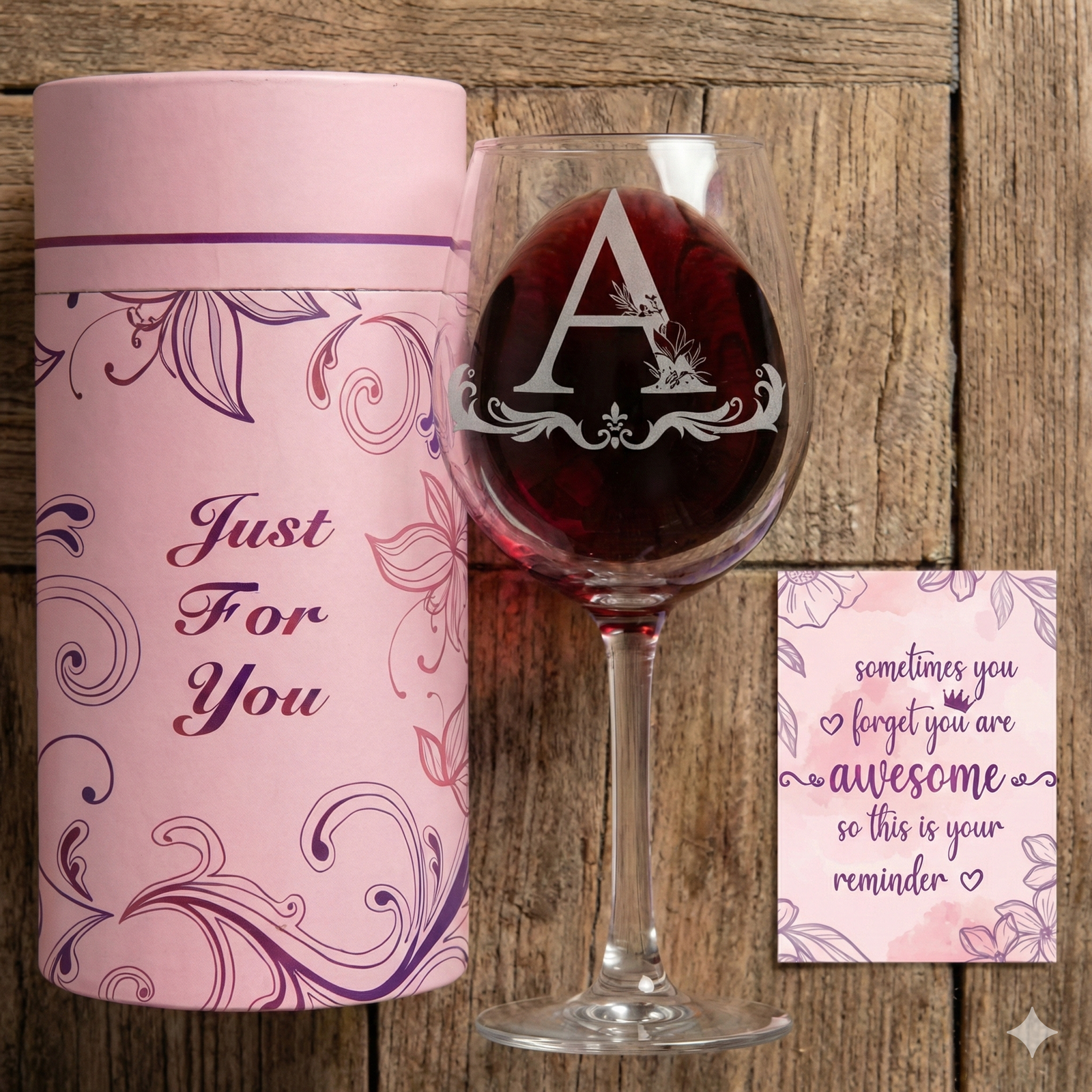 This elegant gift setup captures warmth, thoughtfulness, and refined taste in one beautiful scene. A clear wine glass filled with deep red wine stands gracefully at the center, featuring a delicate monogrammed letter “A” etched with floral detailing, adding a personal and luxurious touch. Beside it rests a soft pink cylindrical gift box adorned with graceful floral patterns and the words “Just For You,” setting a heartfelt tone. A small decorative card completes the arrangement, carrying an uplifting message that reads, “Sometimes you forget you are awesome, so this is your reminder.” The gentle background, with cozy neutral tones and soft lighting, enhances the calm and intimate mood.