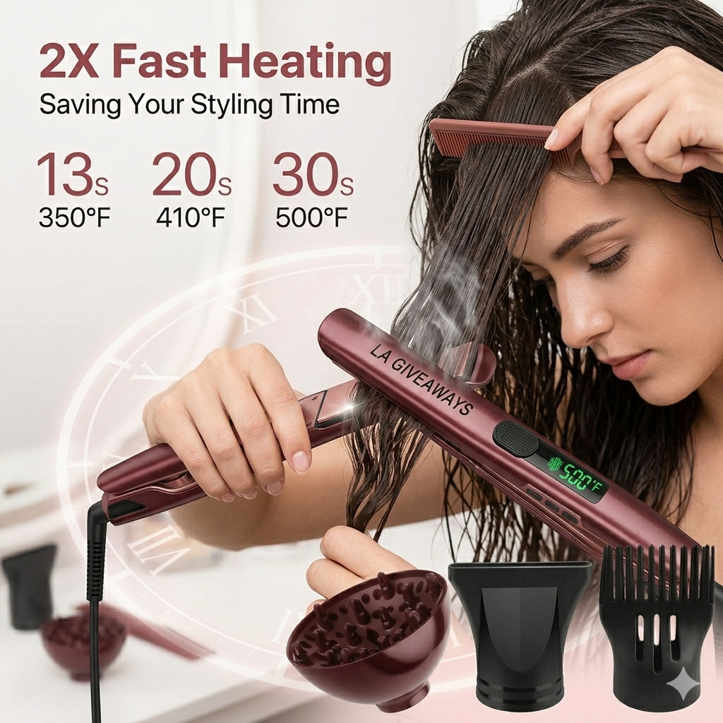 Professional digital LED hair straightener with adjustable heat, fast heating plates, and smooth styling control.