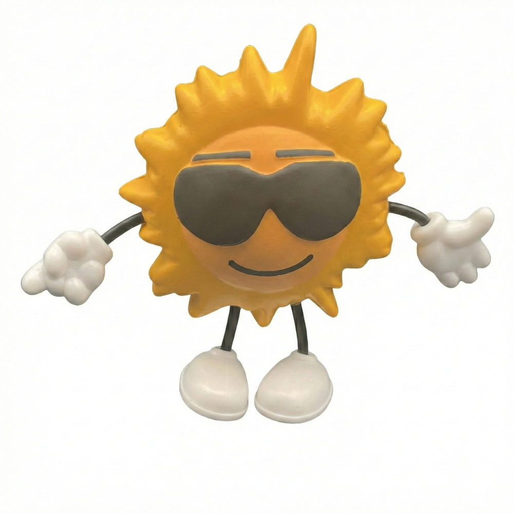 Playful sun stress ball with sunglasses and poseable limbs. Soft, squeezable foam adds fun stress relief and brand visibility.